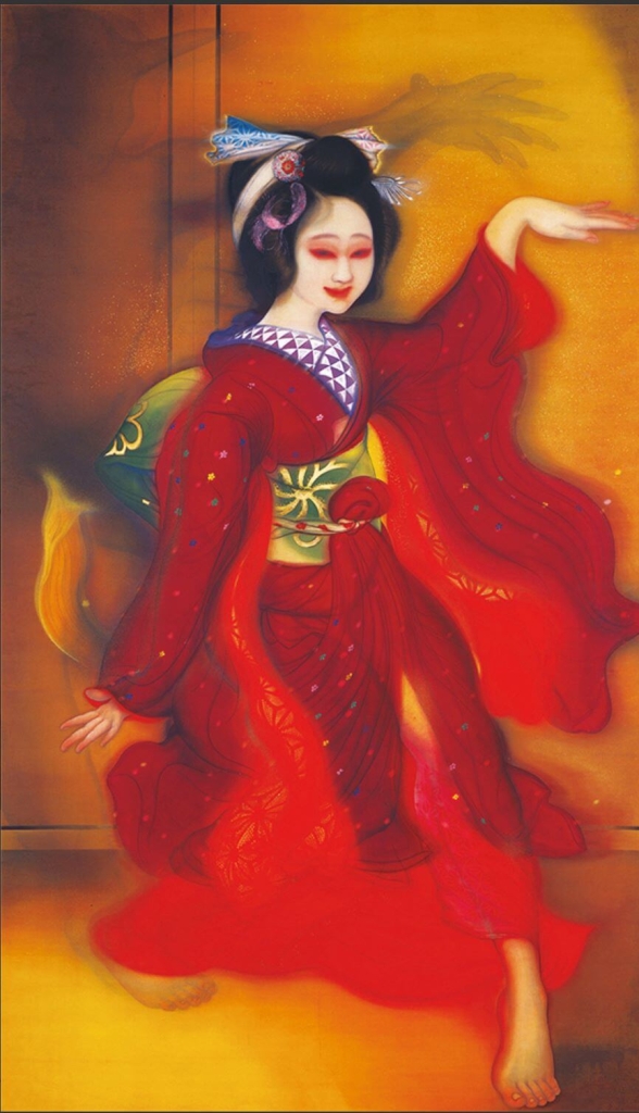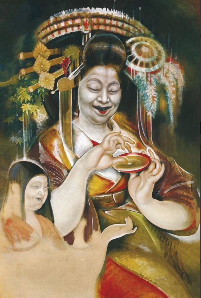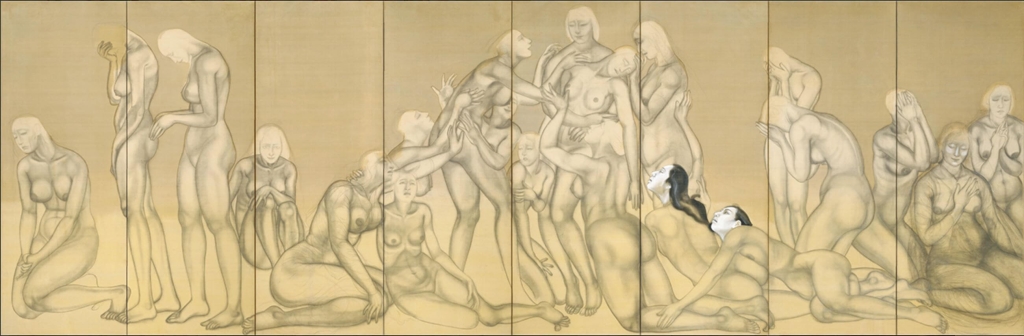 窮30多年描繪的集大成之作——《虹橋》(原名七研),卻與畜生塚有截然不同的畫法。7位被稱為大夫的最高級歌舞伎俳優一字排開,在1976年個展出展時,他重新抹去了所有的臉,換上新瓜子臉。面長而白、眼細橫與鼻垂直、恰似浮世繪裡的畫中人,也趨於近、現代不分男女的和式理想型。致敬傳統而華麗的彥根屏風、華山小袖,年少的他將對藝術的所有直覺、知識與任性都融入其中。在提倡繪畫屏除文學與音樂,達純粹美感之際,他堅信只有藝術家將自己喜愛的音樂、文學與文化應用入畫,才能創造繪畫的生命力。(註5)