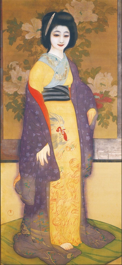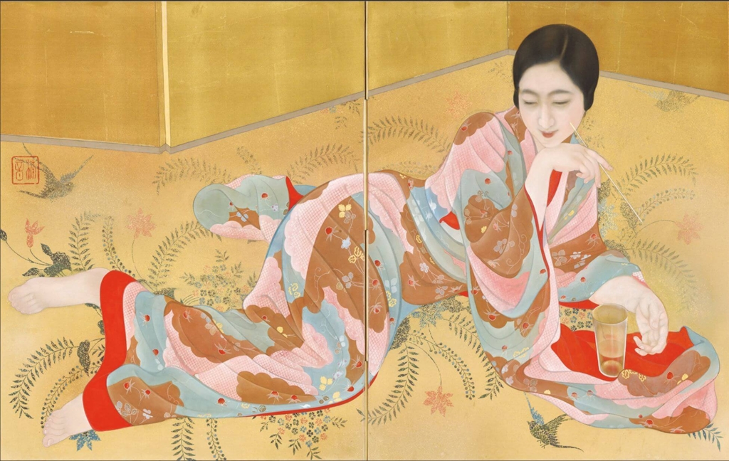 縱使年少時期受傳統繪畫教育,叛逆的他卻多待在圖書館,浸淫在西洋美術史圖錄中。14歲時,他在書中與《蒙娜麗莎》邂逅,並醉心於達文西。《橫櫛》裡頭畫中人的似笑非笑,即是對《蒙娜麗莎》的微笑致意。這是從他24歲在「第一屆國畫創作協會」的出道處女作,畫名與內容取材自歌舞伎,悲戀中的女主角阿富為了心愛的男人謀殺、負罪、最終心碎自縊。和服上交織的愛火與怒火尚未付之一炬,不勝唏噓。再來看人物臉部特徵來源自甲斐莊楠音的兄嫂。根據年表,即可知道畫家的哥哥與兄嫂帶他看劇的經緯——雖然他兄嫂不幸在當年過世,甲斐莊的創作皆來自記憶。後方的屏風則是臨摹北宋趙昌的《牡丹圖》,若綜合前述所提的《蒙娜麗莎》,即可知日本畫深受中國繪畫影響的同時,新日本畫欲脫傳統、積極套用西洋造型的意旨。