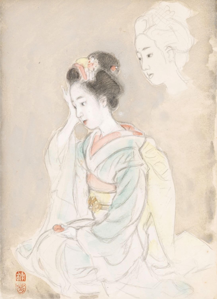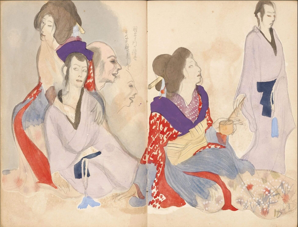 他的手稿足以顯示近乎不合理姿態、美醜參半的肉身,為何得以一眼直逼靈魂,活生生地傳達體溫。眾般草繪中,他悠悠留下一句神秘訊息——「肌香。香氣漸溶。流體之香。」成為後來藝術史學者特愛討論的切入點。同一姿勢擁有上百種微調揣擬:眉宇顰笑曲度、頭髮盤旋或傾落、頭・肩・背相倚的開闔角度、雙腳交錯跪坐法⋯⋯,甚至進行植物寫生,將其嬌柔貌應用至人體。至於剪貼簿,可以見他橫越古今中外的閱人無數,從金髮尤物、深山部落女性、劇照廣告、無邪學生至多重角度拍攝的同一模特兒外,也特愛記錄每場傳統戲曲的心得感想。那些不曾被他入畫的身軀都成為了他的參考點,活成畫中人或他親自演出的女性。