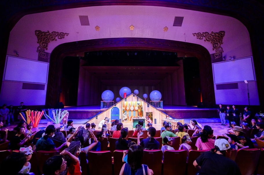 《這裡沒有大野狼》演出現場,在演出空間設計上,除了配合劇本的故事情節,更結合中山堂本身的空間條件。(© 2019台北兒童藝術節)