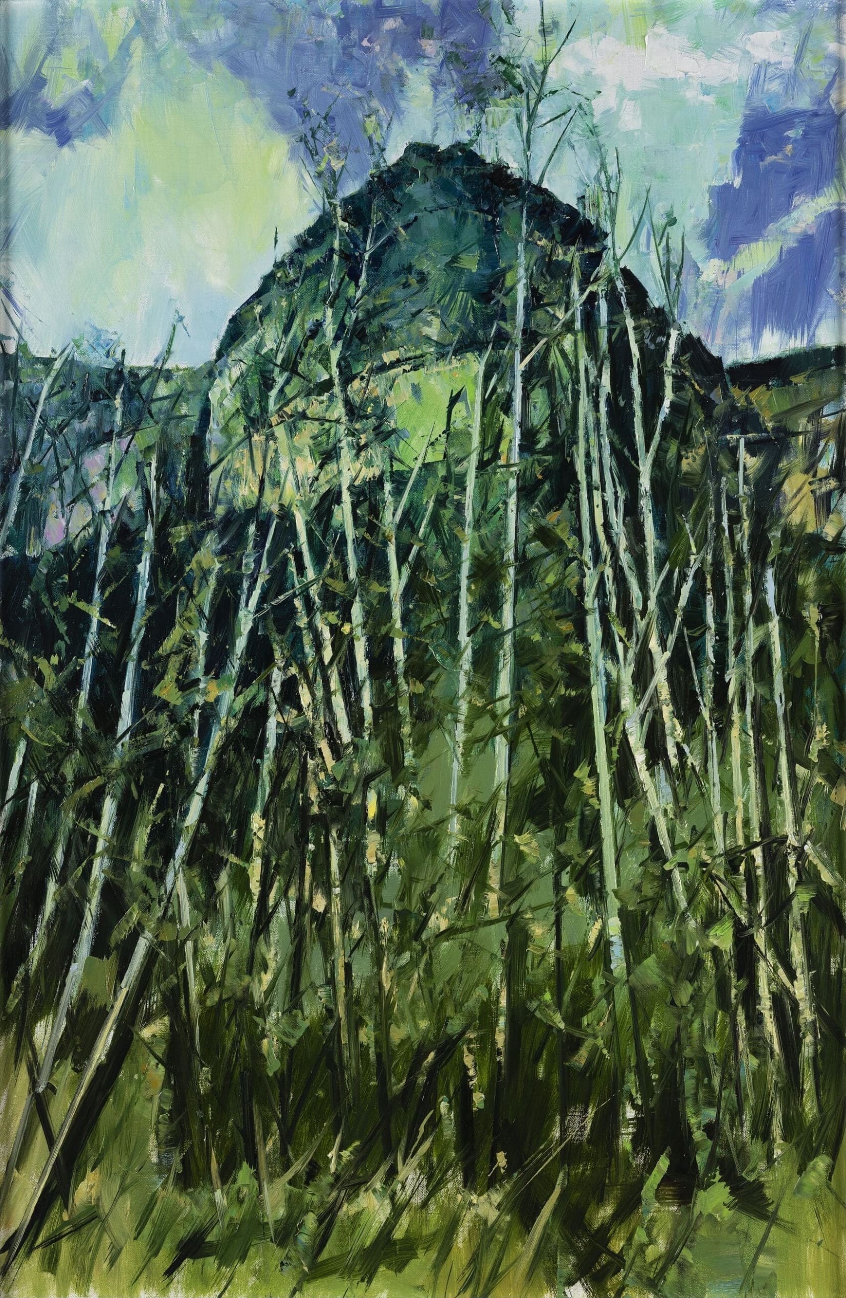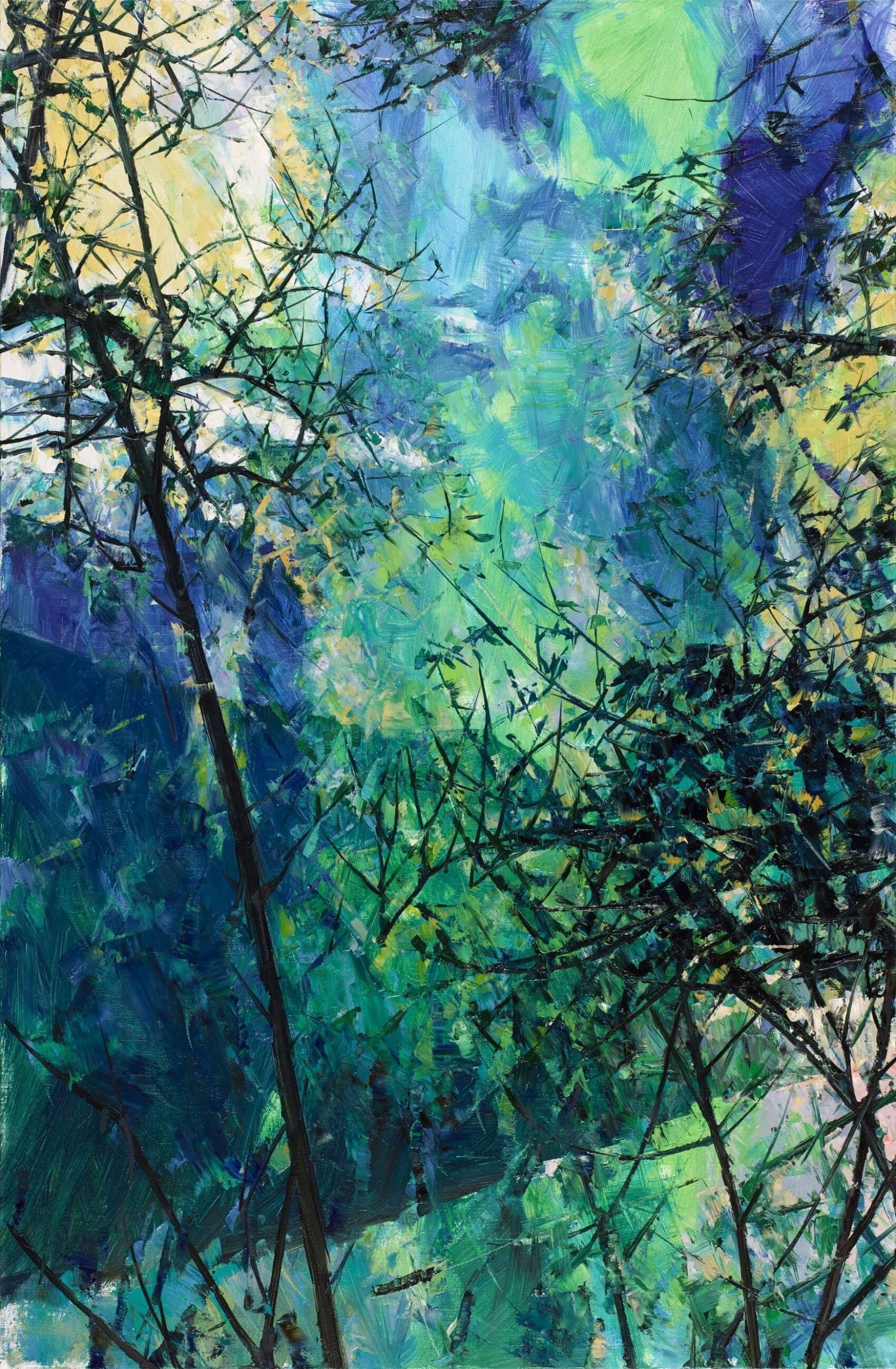 「山水畫」作為中國繪畫藝術精神的最高表現,總是給人黑白水墨的圖像印象。然則,若回望山水的歷史,「設色山水」事實上更早於「水墨山水」,也因此以「油畫」畫「山水」對於色彩的著重與體會,實則回溯了一個更為久遠的山水歷史,以及對於「自然」的體會與描摹。值得注意的是,許江始終強調中國的「山水」認識並非西方客觀視覺的「風景」。一如藝術家所言:「我們的祖先,他們畫山水……是將這個山水的觀看存在自己的心裡……」這一層認識,回應了苦瓜和尚《畫語錄》所謂:「蒐盡奇峰打草稿」此一自然意識與認識的傳統。而以油畫體現山水意境的努力,更可以說是中國繪畫篳路藍縷的百年行進,其中許江最為傾心的是趙無極與吳冠中兩位。從藝術家凝思的藝術家回望,我們似乎可以理解作品《湖岸蓮花》、《珠山》其隱然間對於承繼了吳冠中那擅長以「水平」佈局鋪排江南水景的特質,乃至於趙無極垂直流淌的抽象意氣。