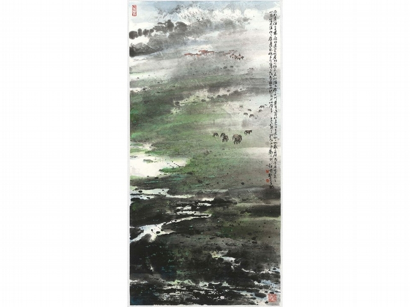 江明賢2018年作《祁連山下》,136×69公分。