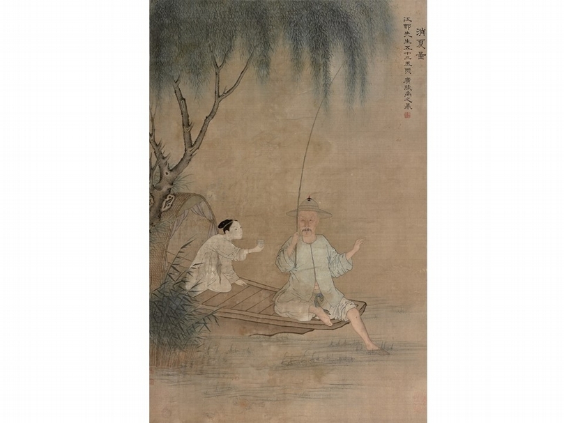 康熙年間的著名肖像畫家禹之鼎(1647~1709年左右),字尚基,號慎齋,江蘇揚州人。曾入京任鴻臚寺序班,並以畫供奉入直暢春園。禹氏幼年師從藍瑛,出入宋元畫人諸家,人物寫真秀麗古雅,許多朝野名流多曾請禹之鼎摹繪圖像。此處的主角為高士奇(1644~1703),其字澹人,號江邨,浙江錢塘人。他是當時極具聲望的鑑藏家,不但工書擅畫精收藏,亦供職內廷官至禮部侍郎。畫中高氏頭戴斗笠,身著常服,手持釣竿,一派悠閒的模樣,恣意坐於舟楫前方。他的右腳曲弓,左腳入水,神情顯露出舒適安詳的態度。伴隨高氏的還有一位女侍,正端著茶杯往前遞送。在右上角的畫題點明此為主人翁的消夏避暑休閒活動,並留下題識「江邨先生五十二玉照廣陵禹之鼎」,可推斷此件畫作完成於1696年間。整幅人物刻畫精細,形神畢肖,面容部分以勾勒為主並加色暈染,衣紋筆墨則顯流暢,但其餘周圍布置應是由其他畫家補景完成。