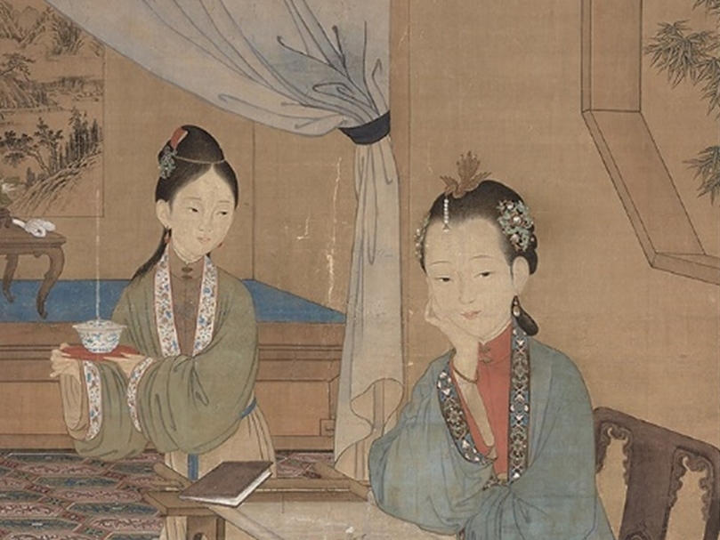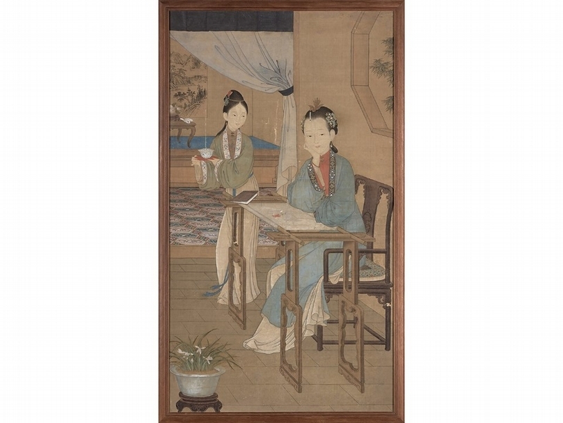 如果說〈祝壽圖〉表達出某種對外性的喜慶氣氛,那麼〈織繡圖〉則透露著私密感的靜謐氣息。畫中女子頭戴金翠珠寶髮飾,身穿高領紅衣,下著白裙,外罩半透明藍紗。其一手托腮,眼光朝前含情脈脈,身體略為傾斜在織繡架上。一旁的侍女同樣打扮時髦出色,雙手持捧漆製紅盤,上頭放著一只青花紋飾瓷杯。此處人物身材比例略顯纖瘦,空間視點設計頗受西法影響。畫家在多處地方添加巧思新意,例如領襟、袖口、坐墊與地毯部分,都費時施繪五彩繽紛的花紋樣式,顯露出十足的裝飾美感。而窗外的綠竹、牆上的山水畫、几上的佛手瓜與如意以及前景的蘭花,無不具有文人雅緻的象徵意味。此外,刺繡這一主題在傳統古典詩詞裡相當流行,被認為是女子等待情人過程中用來消磨時光的最佳方式。但留下的問題是,這位美麗佳人是在等待夫君還是恩客呢?