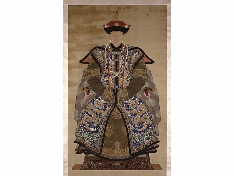 與上述繪畫不同的另一類人物肖像畫為「祖宗畫」,一位婦人穿著正式冬季朝服,肅穆地端坐在椅子上,奢華富麗的服飾與裝扮,指明她應為清宮內某位后妃等級的尊榮人物。她的朝冠以薰貂製成,上綴朱緯,另有黃金珠寶等珍品飾之。朝袍色用明黃,批領及袖口部分皆增添貂緣,肩上下襲朝掛之處,也同樣加上貂緣。朝掛主體則色用石青,鑲片金緣,繡紋前後出現立龍各二,下幅另有八寶平水圖案。在飾品方面,她的領約以鏤金製成,添飾玉珮數枚,間以珍珠,兩端垂掛明黃絲條。而朝珠則有珠玉和珊瑚等類,不論佛頭、紀念、背雲或大小墜皆以寶石雜飾,整體設計搭配得宜。此外她的座椅是以剔犀工藝製成,其間還可隱約看見部分存留的地毯圖案。推測原畫底部應繪有地毯,但後來因為重新裝裱的關係而被切割。此類圖像主要存放於祭壇宗廟內,每年時節則由後代子孫在像前供奉紀念。