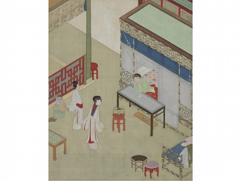 這次展覽中有兩套冊頁相當受到觀眾的熱烈討論,首先第一套是〈金瓶梅插畫冊〉。自明代以來,為了吸引讀者的購買慾望,古典小說出版品裡大量出現繡像插圖。透過圖像產生的視覺想像,為原本單純的文字敘述增色不少。後來這些圖像脫離插圖脈絡,而由畫家另行創作單行本流傳於世,如同館方珍藏此作所示。這回展出畫幅之一為「花子虛因氣喪身」,花子虛為鄰居西門慶的結拜兄弟,是李瓶兒的丈夫。圖中花子虛面露病容,棲身躺於床上,無助地望向前方,手指著面前的李瓶兒。而李瓶兒卻只是無情地回眸一看,向兩側攤開雙手,顯示出夫妻倆的寡恩淡薄情分。此外圖中的室內裝飾與家具陳設,透露主人翁的奢華富豪生活。這些物品外觀的精美紋飾與豔麗色彩,切實地傳遞出《金瓶梅》世界中的時尚媚惑與玩好風尚。