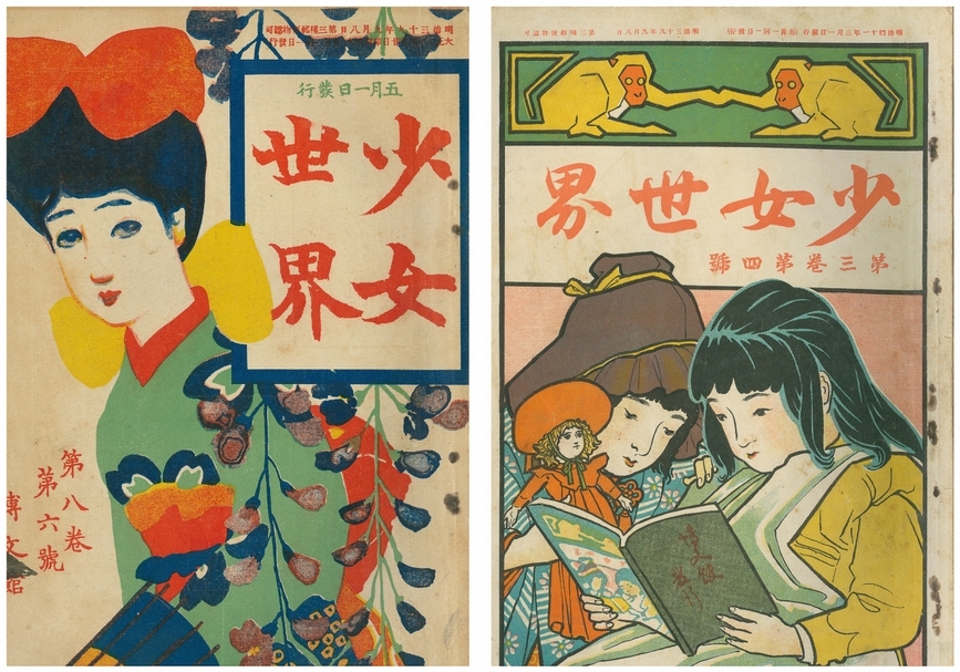 西元1911至1913年(明治44年至大正2年),《少女世界》第8卷6號(左圖);山村耕花繪製《少女世界》第3卷4號封面(右圖), 島根縣立石見美術館館藏。(北師美術館提供)