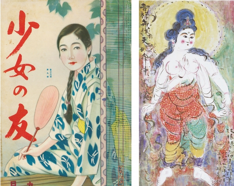 左圖:深谷美保子為《少女之友》第26卷9號繪製的封面,1933年(昭和8年),島根縣立石見美術館館藏;右圖:棟方志功《御吉祥大辨財天御妃尊像圖》,1966年(昭和41年),青森縣立美術館館藏。(北師美術館提供)