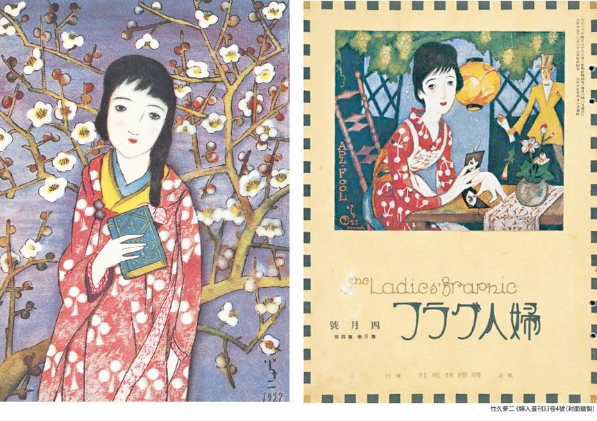 左圖:竹久夢二《白梅》,1927年2月(昭和2年2月),取自《少女世界》, 彌生美術館.竹久夢二美術館館藏;右圖:由竹久夢二繪製《婦人畫刊》第3卷4號的封面,1926年(大正15年), 島根縣立石見美術館館藏。(北師美術館提供)