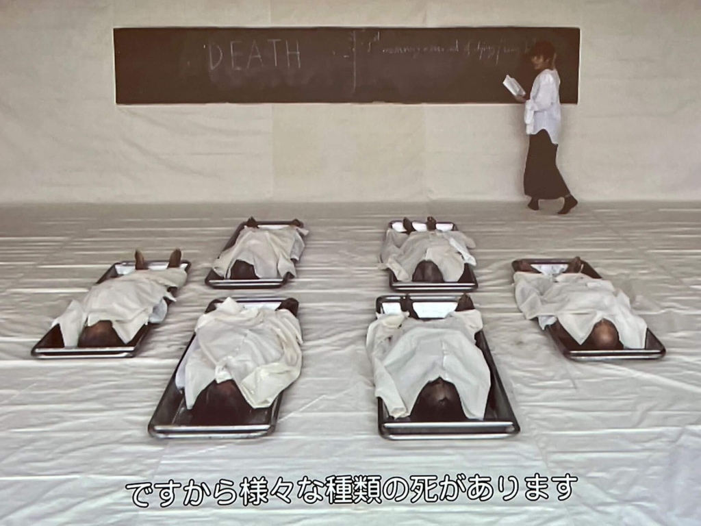 館長片岡真実也對臺灣藝術家蔡佳葳的作品《在豆腐上寫經》甚為喜愛,藉由在蓮葉、豆腐與橄欖樹皮寫經,記錄非物質的精神落在注定腐朽之物的交互作用。另外,泰國藝術家Araya Rasdjarmrearnsook,則是在宛如教室的遺體安置所,對屍體進行死亡教學,藉由活人與死者的平等對話,也讓我們與對死的恐懼和解。或許生死哲學的答案仍是迷茫,但在看完作品後,或許毫無知覺的我們已用全新的自己再活一遍。