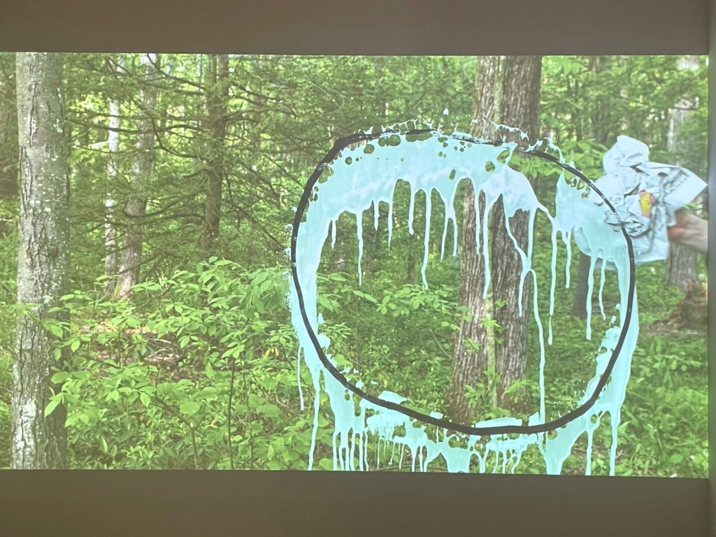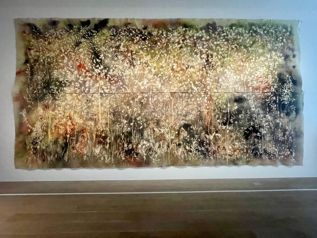 過去藝術家以接觸自然素材,作為靈感的開端。愈趨現在,自然環境問題與全球暖化亦成為藝術家極為關注之議題。展間內近乎等牆大的帆布作品,是來自美國藝術家Sam Falls為虎之門之丘製作的公共藝術。僅是將當地花草與染料放置一晚即產生風吹日曬之感,留下的人類鞋子與貓狗足跡參入其中,頗有自然與人類共存之意。