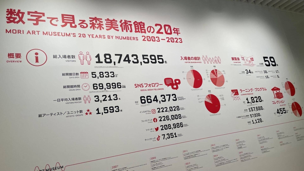 回顧森美術館建館初期,便努力將此機構打造成如紐約MoMA美術館般的世界級景點。連動合作六本木的飲食、消費、夜景觀景臺,只為讓各種機緣下來到六本木的國內外人士在經過時,產生一訪展覽的起心動念。這樣的立意也在展覽主題中有跡可循,從開館十週年紀念展「LOVE展:從藝術中看見愛之形狀―從夏卡爾至草間彌生」至本次「World Classroom:現代藝術的國語、算數、理科、社會」⋯⋯每檔展覽名稱足以表示對各種族、性別、年齡層的歡迎與誠意,如此態度也奠定了森美術館於世界中的重要性。