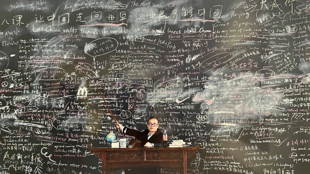 作為本展主視覺,王慶松《Follow Me》製作於2008年北京奧運的隔年。主題名稱源自於1982年著名的中國節目,不僅教授英語,也加入許多歐洲社會樣貌。畫面中藝術家裝扮成老師,板書上寫著「讓中國走向世界、讓世界了解中國」的口號,桌上也擺著可口可樂,表現西洋對中國的影響與中國急速現代化的縮影。