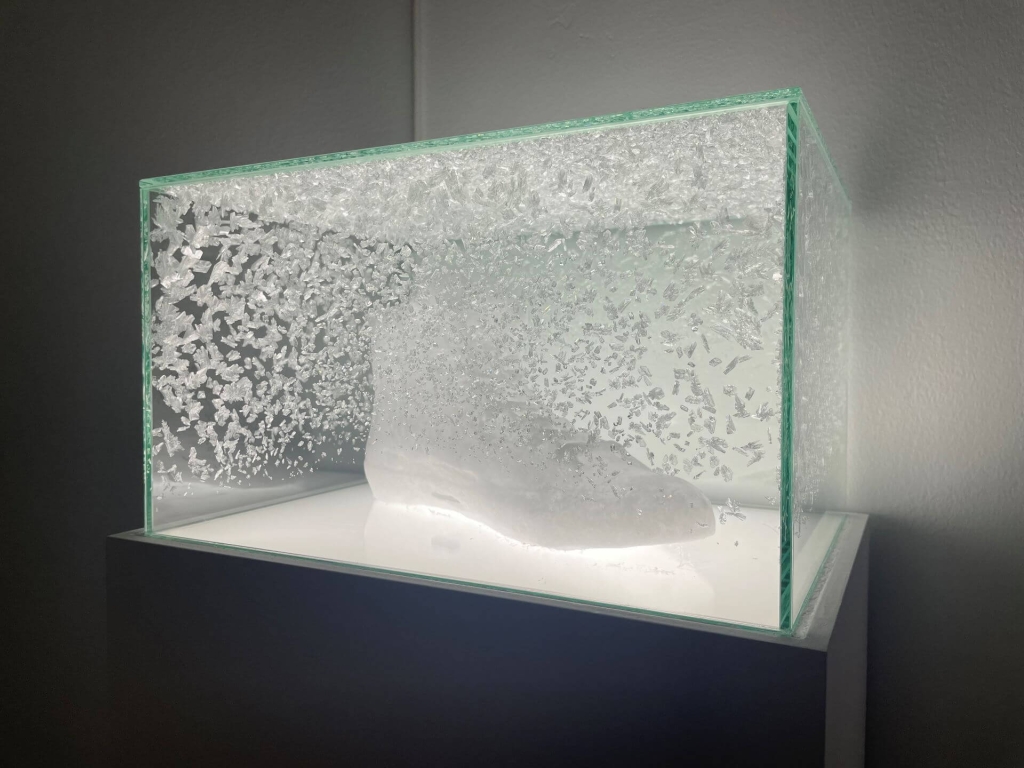 同樣顯示化學之美的是宮永愛子的新作《Root of Steps》。以六本木的居民、上班族與美術館館員鞋子形體為題材,藉化學元素苯組成雕刻。苯在樹脂與玻璃封存下,於常溫中無限循環著昇華消失與固化形塑。動態變化藏有時間,於是都市的奔波辛苦不再只是無形,而是真實轉化成社會貢獻與自我實踐的能量。原來自己與化學之間,可以寧靜、聖潔、充滿希望。
