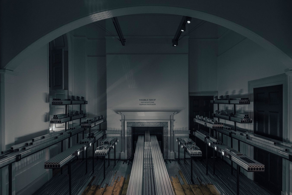 本次倫敦設計雙年展台灣館由經濟部工業局主辦、台灣設計研究院執行,邀請策展人曾令理、大聲光電及偶然設計團隊合作,以「Visible Shop: Parts Without Cover」為題,以大量的金屬零件、電磁鐵展現五金行般的展覽現場,藉此回應台灣製造業的發展樣態。展場中央的主要作品由姚仲涵、曾睿彬、張玲維三位成員組成的大聲光電團隊創作,是一件由672顆的電磁鐵組成,約六公尺長的大型動力裝置,每一個電磁鐵隨機跳起,電磁鐵的作動與不作動而產生出抽象、流動的動態畫面,成為展間主要的視覺。大聲光電團隊也提到,本次展出的裝置結構複雜,加上展覽主辦單位非常重視安全,因此也在各種測試及風險排除上花了許多的時間來符合安全檢查的要求。