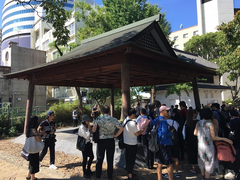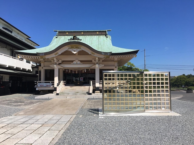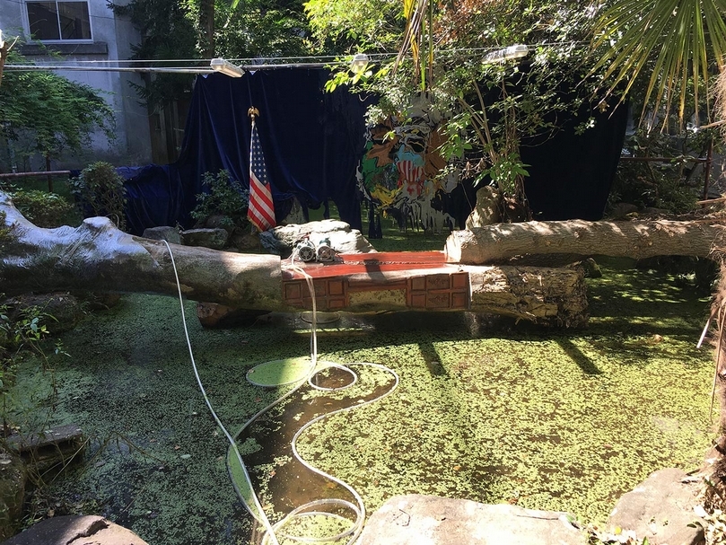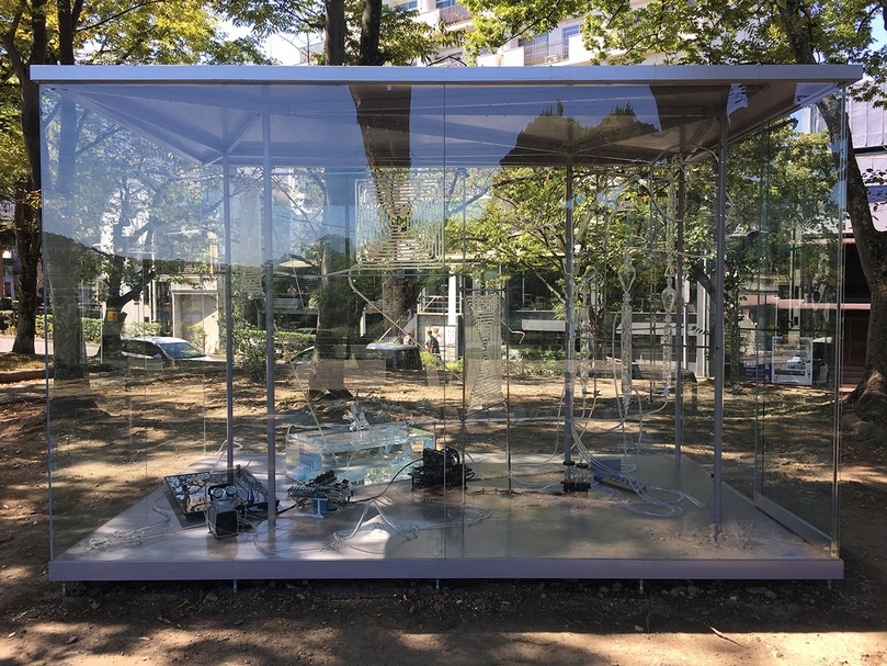 走出內山下小學校沿著旭川一路走下去,觀眾就會在沿岸看到梅麗莎.杜賓和亞倫.戴維森(Melissa Dubbin and Aaron S. Davidson)的《延遲線》,在這個機械裝置當中,他們抽取了旭川的水,將它透過各種生物實驗式的加工之後,在此形成一個獨立運行的生態系統,並將其隱喻為羊水與人體子宮孕育生命的自然狀態。同樣是指涉到水作為萬物之源的藝術表現,此作《延遲線》將岡山地方的自然物質細膩化至最單純的自然狀態,與前段紀勞德與西博尼的藝術計畫相比,他們將水池作為政治霸權之源的開端,不斷向廢棄的空殼輸入嶄新卻負面的動能,兩者也出現了這截然不同的表現狀態。而當我們繼續一路散步來到岡山神社,除了可以看到丹.格雷厄姆(Dan Graham)以各種木料與玻璃模擬神社建材質感的《木製格子交叉》之外,神社境內因為二戰美軍燒夷彈轟炸的痕跡亦延續了這些近代史中千絲萬縷的糾結與哀嘆。