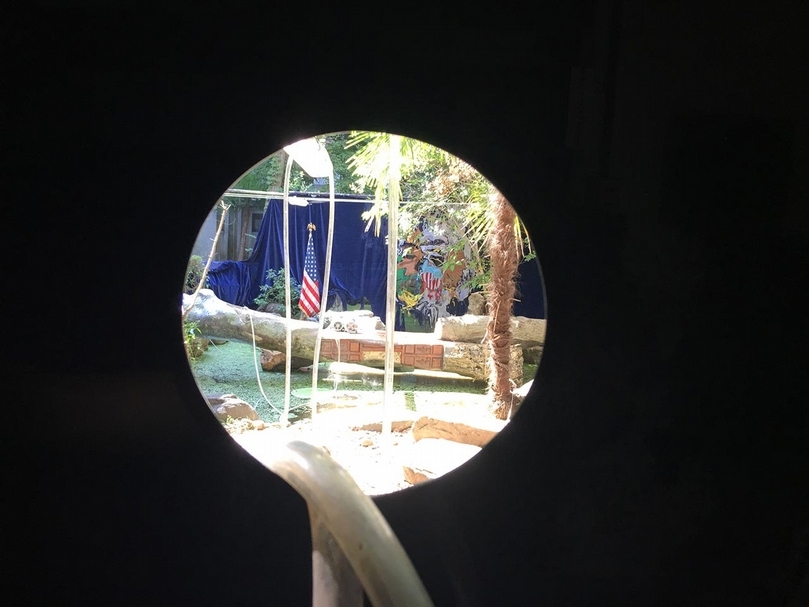 插有美國國旗的戶外水池。(攝影/陳飛豪)