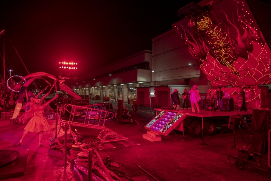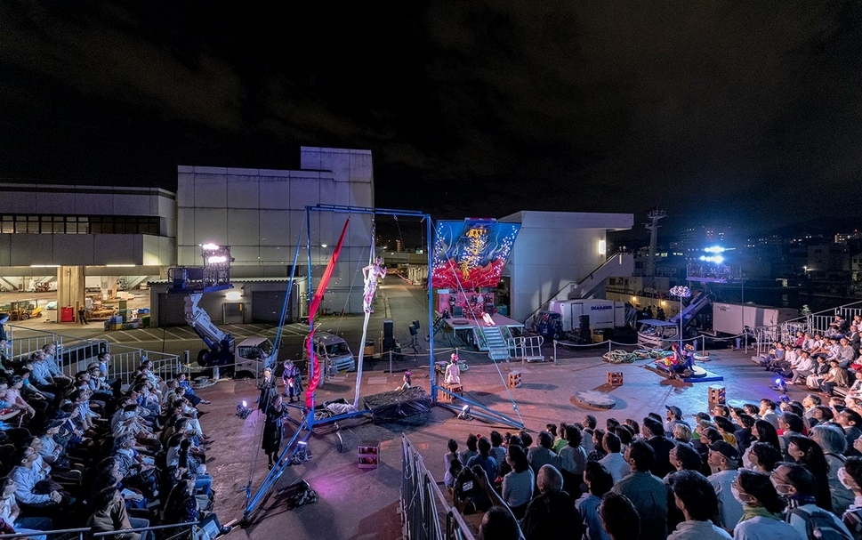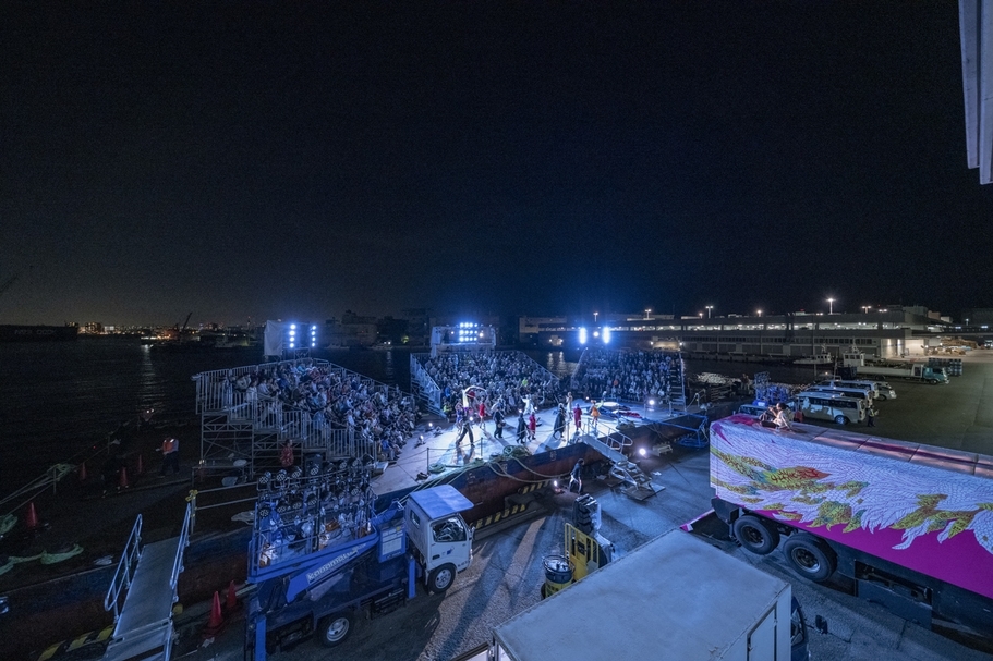 柳美和(Miwa Yanagi)透過改裝的台式電子花車以《日翼之輪》為名的實驗劇場巡迴日本,並於此次藝術計畫中在神戶的百年大港邊演出。(攝影/ OMOTE Nobutada)