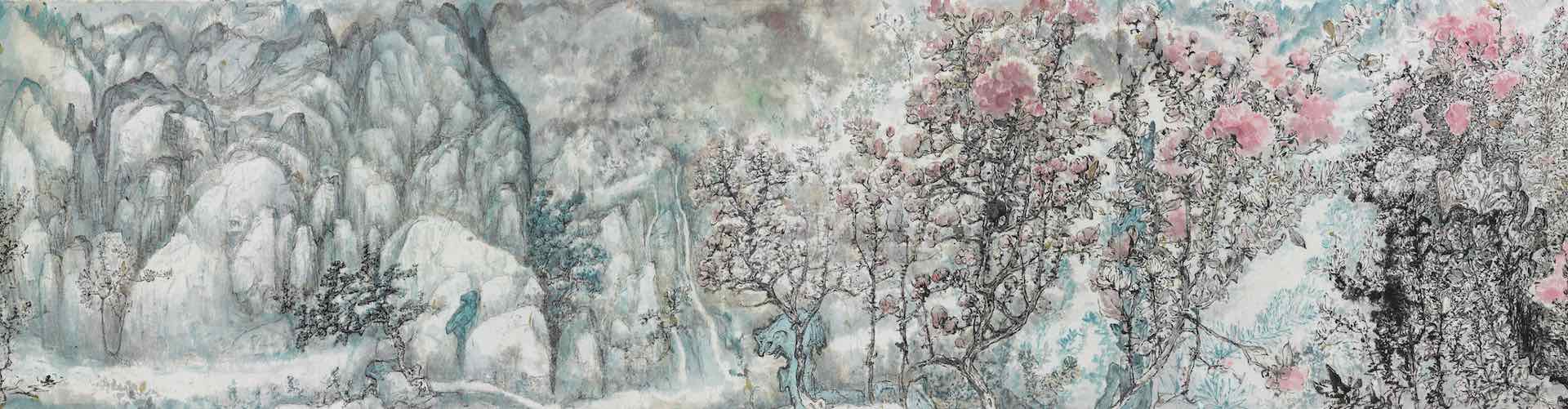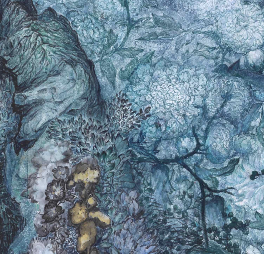 中國繪畫史一直以來都將山水和花卉歸為兩種不同的題材,能在山水和花卉上有同等造詣者屈指可數。明代沈周可謂一例;清初有惲壽平石濤;而近現代,雖有趙之謙、吳昌碩和齊白石等花卉大家,唯有黃賓虹,山水花卉皆精。與前人不同的是,彭康隆不再將兩種題材區分開來,而是將山水與花卉融合在一個統一的構圖之中。這一前所未有的突破也在彭康隆藝術創作的諸多方面引發了變革性的創新,其中包括:筆墨、色彩與色調、空白與留白,以及空間與縱深的構圖處理。