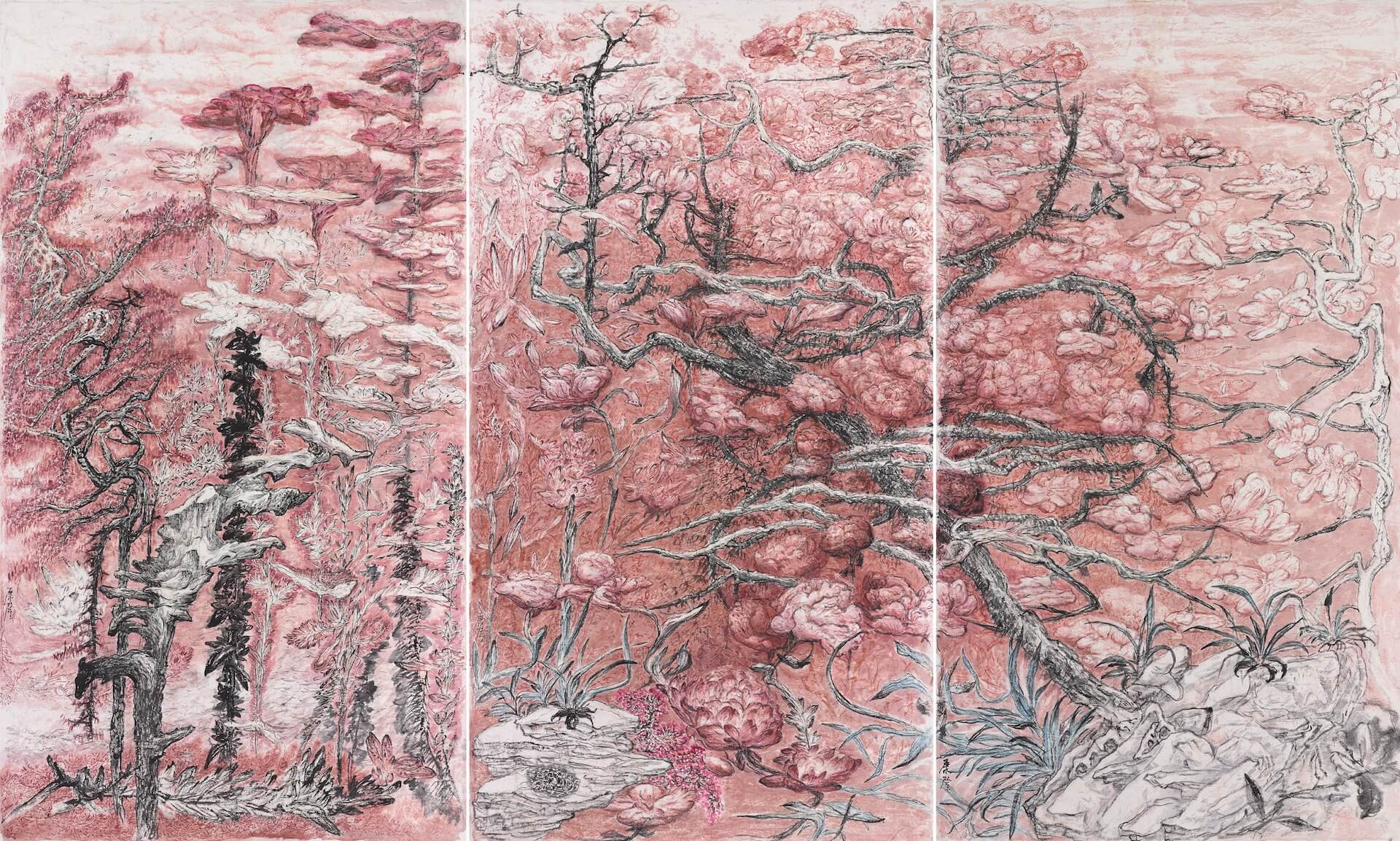 我從大學畢業作品中的秋山就用了紅色,之後我畫花的時候也用了紅色,不知不覺地發展出一種單色繪畫……我只是把水墨畫該有的筆觸和該塑造的形體,變成顏色來表現。
