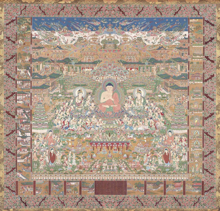 本區展出奈良時代大鳴大放的佛教文化之文物。《粉地彩繪八角几》(展出編號21)近似於當時大寺殿堂內的彩色裝飾,象徵著天平時代佛教文化的華麗配色,十分引人注目。閃耀奪目的《紫檀金鈿柄香爐》(展出編號22)使用了貴重的紫檀木材並以金鑲嵌,是極具莊嚴的佛具。此外還有《金銅鳳形裁文》(展出編號23)和《金銅雲花形裁文》(展出編號24,譯註4),一般認為這些威風凜凜的大型文物是用於裝飾大佛開眼的供養場所,讓人不禁想像起當時儀式之盛大。