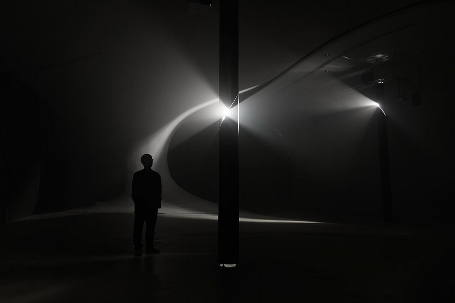 接著進入此次「呼吸的路徑」展演現場,首先映入眼簾的是一片透著亮光的白霧,在一片迷茫之中,透過光的來回運行,觀眾便可從牆面的反射與來回,意識到場域獨特的造型,即那彎曲且高低不整的建築型態。隨著光的來源走入展場深處,佇立著兩個圓柱體的大型裝置,可觀察到光源來自於其上彎曲的裂縫,從上投影出的數據上上下下,彷彿記錄著有關於展場內某種數值的變化狀態,若觀眾仔細觀察便可以發現,數據標示越跑越快時,光的上下來回速度,以及與其搭配的聲音就會加快移動的速度。這有可能是一個觀眾在未知情境之下進入這個展演空間時的觀賞心得,但在有意與無意間,若抽空細看了展覽的介紹簡介,就會恍然大悟,原來那上上下下的數據,其實是空間的二氧化碳濃度,只要人一進去改變了裡面的空氣成分狀態,聲音與光源的裝置就會對此作出反應,亦即在進入展場的一瞬間,觀眾其實就成了展演的要素所在。