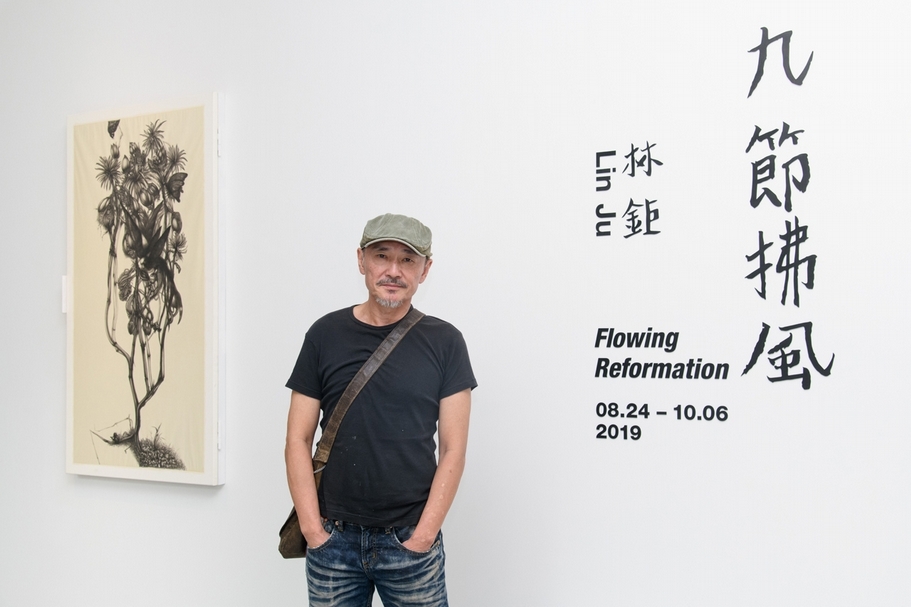 在林鉅眼裡,常玉的心像盆自在行走的花,可能嬌柔、婀娜、既英凜又華美,有著他貴族的嘆息,和對於庸俗的不耐,從他的畫能嗅到蝶影的香氣。林鉅確實是將疊合在常玉與中國水墨繪畫中對於留白、逸氣的質地,偷渡到他「九節拂風之常玉演」等系列,常玉畫裡的枝幹有文人畫的君子遺氣,那些歪折的枝幹象徵是一種內在道德的不屈;林鉅的枝枒沒有要矯作任何氣節象徵,而是在植物結構中,張牙出一種我生而如此的坦蕩,枝枒攀附、蜷曲、纏繞透露的是對生存本質的依戀。常玉畫中的靈氣,在林鉅筆下的「常玉演」卻是「麟」氣,像光滑的皮膚被異種入侵後蔓生出麟片,人體的結構都在,但本質卻已異變,但突變卻未造成恐懼,而是讓人奇觀般看著麟片產生的五彩光澤,所迷惑。