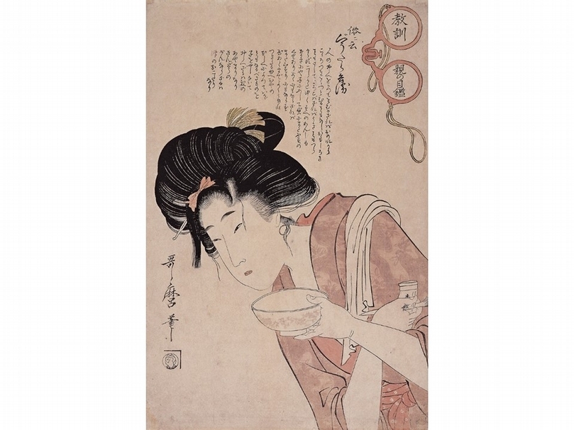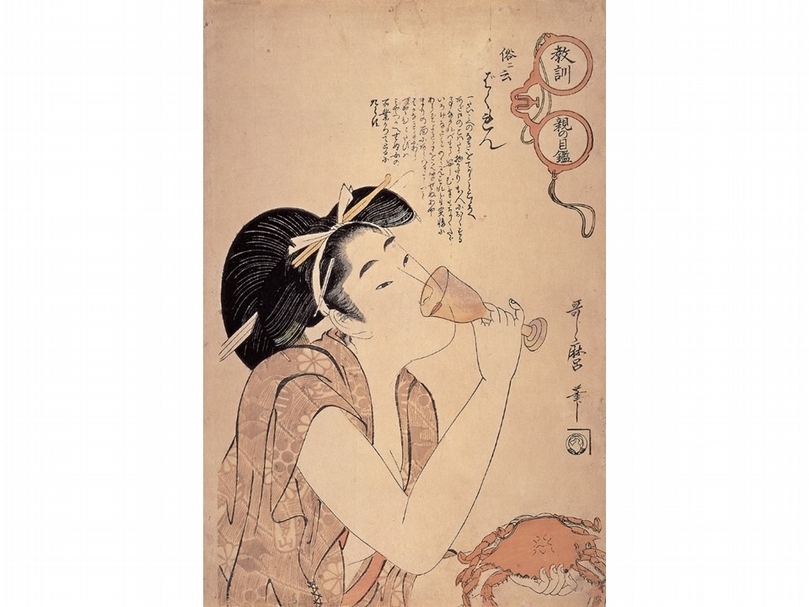 喜多川歌麿《教訓親之目鑑 俗云 惡女》,大判錦繪,享和二年(1802)。 此所描繪的是那些不守常法、不在乎世俗眼光,而且沒有工作經驗的膚淺女性。畫中美女坦露白淨的胸膛,右手拿著酒杯飲酒,左手還豪邁地握著煮熟的螃蟹。美女所穿著的和服上,印著劍菱、男山等名酒的商標圖樣,挽起袖子露出白色手臂,此般不端莊的行為,反而更讓人覺得嫵媚。(文/山本野理子,圖由時藝多媒體提供)