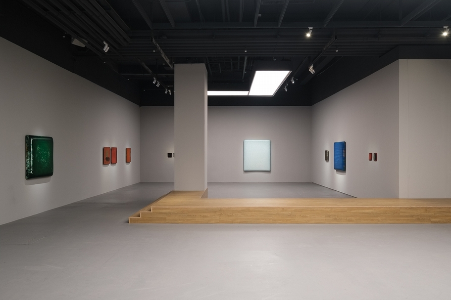 如果說具備充足日照的工作室是「陽」的話,他認為這次在耿畫廊地下一層展示的黑盒子空間便是「陰」。如何將光帶進,許峰瑞則強調並非再現工作室原貌,而是將藝術家創作與環境的整體精神帶入展示現場,更如同是延續藝術家創作中概念性與精神性的體現。許峰瑞以蘇笑柏於2014年展覽自述中所提到的「其實我要的不多,我只需要一點點顏色與一點點光就夠了」出發,自藝術家作品中一直以來對於「光」的關照切入,並提取作為陳示的內容。而他也分析道,「那時的光指的是所謂物理性的光,透過光線照射在作品上、凸顯出肌理。」然而,在工作室的一周、每日面對不同的光,他不禁思考「藝術家所謂的『光』到底是什麼?」