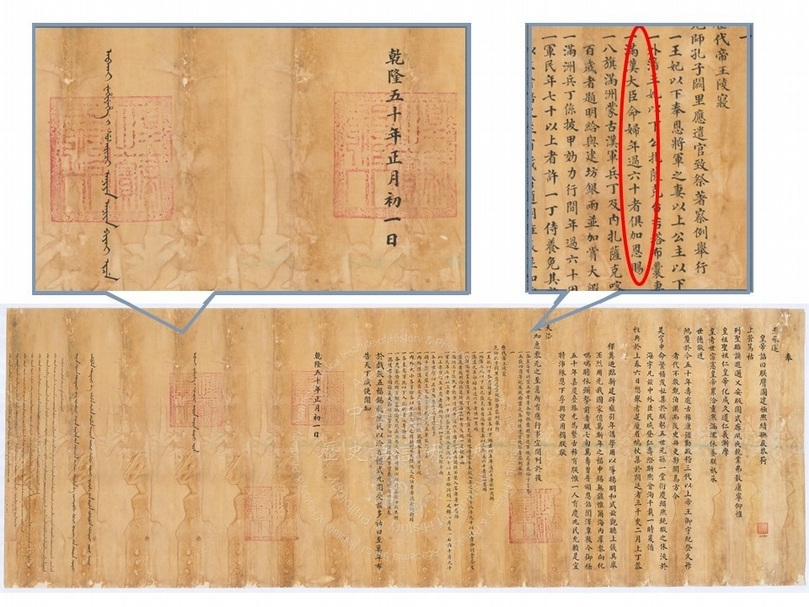 《高宗純皇帝御極五十年大慶恩詔》,乾隆五十年(1785)一月一日,80×228公分。此為清宮頒布的官方文書,以滿漢二文撰寫。而從文件中可見皇帝有多項恩賜,其中一項是頒發獎賞給年過六十歲的朝廷官員妻室。(圖片提供:中央研究院歷史語言研究所)