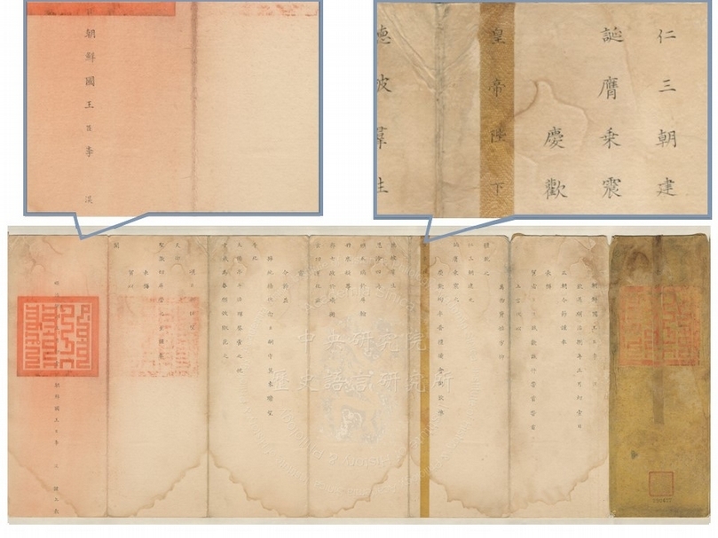 《朝鮮國王李淏表賀元旦令節》,順治八年(1651)一月一日,摺件,每扣34.2×12.3公分。細部可見「皇帝陛下」的黃綾及朝鮮國王李淏題名。(圖片提供:中央研究院歷史語言研究所)