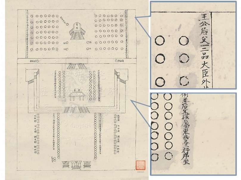 《太和殿筵宴位次圖》經過紅外線掃描還原,發現底圖是規劃同治十一年(1872)大婚喜宴之位次圖。塗改處原為「后父」與「后父族屬」等文字註明。(圖片提供:中央研究院歷史語言研究所)