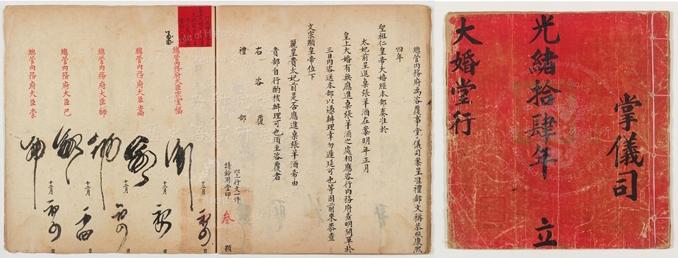 除了詔書之外,我們還可以透過「大婚堂行」簿冊來了解婚禮的大小面向、各種細節。光緒帝的大婚在光緒十五年(1889)舉行,整個籌辦工作在光緒十四年便已展開。「大婚堂行」簿包含五份檔案,在每份檔案的標頭,浮貼紅色小籤。內容為舉行大婚前的各項準備事宜,如:王大臣交玉如意給奏事廳、納采宴內務府預備樂人等之紅駕衣、綠綢帶、皇后陞輿降輿時間、慈寧宮筵宴辦理餑餑桌張羊酒數目等事。