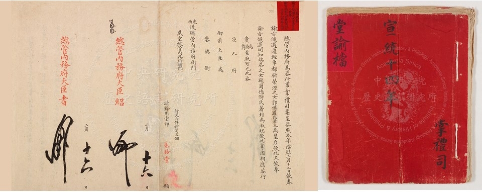 至於1922年僻處紫禁城一隅的小朝廷為遜帝溥儀(1906-1967)舉行的婚禮,或可視為最後一場帝制的「大婚」。史語所收藏之明清檔案裡不僅保存了光緒十四年(1888)的「大婚堂行簿」,我們也意外發現了「宣統十四年」(1922)的大婚堂行稿與堂行簿。而這場眾所矚目的婚禮,壓軸的戲碼是十月十五日午時皇帝御駕乾清宮,陞殿接受中外的祝賀。堂諭檔中第八份文件便是關於陞殿受賀的流程。包括內監樂曲的安排、王公百官如何「各照品級、按翼排立祗候」,從皇帝與皇后入場陞座,到起座退場,都有規範。反諷的是,這場在共和國裡舉行的皇室婚禮,不僅顯示成年的溥儀正醞釀「恢復祖業」的開端,也引發了民國輿論的高度關切,徹底剷除帝制殘餘的呼籲更如在弦之箭。