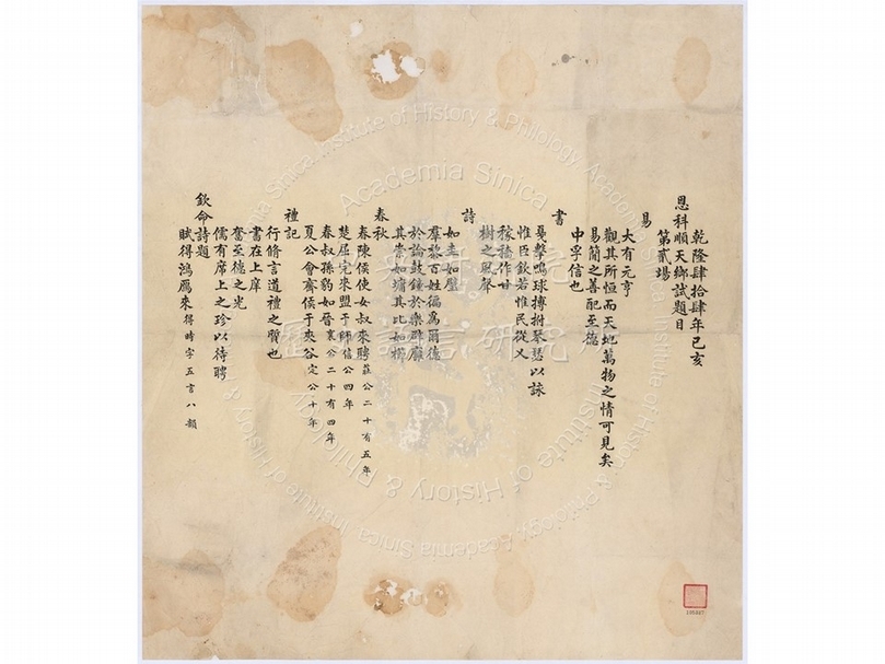 《乾隆四十四年己亥恩科順天鄉試第二場題目》,乾隆四十四年(1779),84.2×77.6公分。(圖片提供:中央研究院歷史語言研究所)