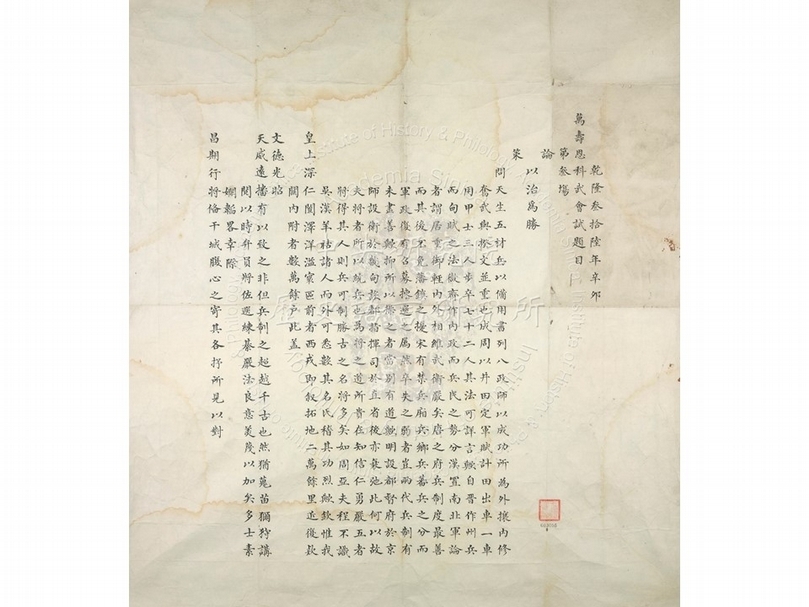 《乾隆三十六年辛卯萬壽恩科武會試第三場題目》,乾隆三十六年(1771),86.7×80.2公分。(圖片提供:中央研究院歷史語言研究所)