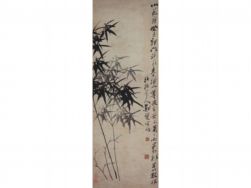 鄭板橋(1693-1765),本名鄭燮,字克柔,號板橋,揚州府屬興化縣人,晚年於揚州鬻畫為生。他善畫蘭、竹、石,尤精墨竹,學青藤、清湘、八大之法,擅長水墨寫意。在創作方法上,提出「眼中之竹」、「胸中之竹」、「手中之竹」三階段論。鄭板橋特別強調要表現「真性情」、「真意氣」。他自稱:「四時不謝之蘭,百節長青之竹,萬古不敗之石,千秋不變之人。」其筆下墨竹,往往挺勁孤高,具有傲骨、剛正之氣,是其思想和人品的化身。