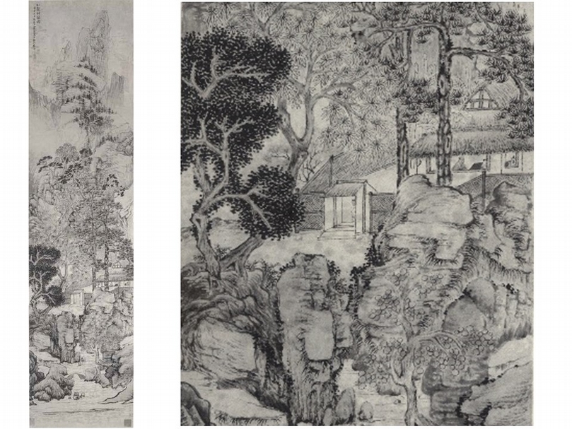 《松聲草閣圖》繪於清雍正十年(1732)七月,是華嵒仿王蒙風格的一件代表作。描繪高士所隱居的山間草閣,全景式構圖,近、中景處滿布密樹叢林與山石,虛實相生,疏密有致。兩株參天巨松下,竹籬圍起一方院落,草閣依山而築。此作雖出自王蒙筆意,然華嵒別出心裁,運用濃淡、乾濕不一的各種筆墨,細膩地表現山石樹木的不同質感,如:山石沒有明顯輪廓線,沒有太多水墨渲染,而是以淡墨披麻或牛毛皴為之,高聳的遠山亦用淡墨勾皴;濃墨點苔,則依遠近、疏密不同,表現草木華滋之樸茂景象,別具清雅脫俗之韻致。至樂樓藏《聽泉圖》則是他另一類的山水人物圖。高士與攜琴童僕於老松下,臨流倚坐,靜聽泉壑松聲,老松虯曲,或俯偃,或盤繞,墨韻有致,筆墨變化豐富,如行雲流水,值得靜心細賞。