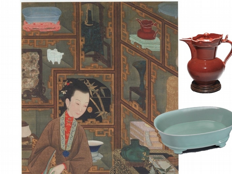 左:北京故宮藏雍正〈十二美人圖.鑑古〉局部、右上:明宣德〈寶石紅釉僧帽壺〉、右下:北宋〈汝窯青瓷無紋水仙盆〉,皆為國立故宮博物院藏,水仙盆將於該展換檔後展出。(圖/國立故宮博物院)