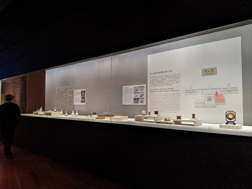 是次展覽策展團隊於第三單元「藏物格架」中嘗試復原了兩組多寶格文物,主要是清室善後委員會於《點查報告》中對於各宮殿的紀錄,發現院藏有兩組文物被登記在「多寶格」欄目下。若再對照嘉慶年間的《陳設檔》,便能整理出這兩組多寶格原在養心殿前殿東暖閣的博古架及養心殿後殿左面牆。侯怡利於展覽導覽時介紹,「我們發現院藏乾隆時期的文物中,有不少附有非常漂亮的架子或墩座,而這些文物在《點查報告》中都被稱作『多寶格』。在翻找檔案之後,我們就發現有部分文物是當時擺放在養心殿的博古架上,瓷器、珍玩等各種各樣的文物混搭。」現場展出有清乾隆《浮水石》、北宋《汝窯青瓷洗》、秦漢《獸耳扁壺》、明宣德《青花纏枝蓮紋三足爐》等,也包含2019年4月被登錄為國寶的明宣德《寶石紅釉僧帽壺》。根據木座底部所刻的「雍邸清玩」四字銘可知,明宣德《寶石紅釉僧帽壺》曾經是雍正皇帝潛邸時的收藏,後成為養心殿陳設品。余佩瑾簡介此件作品時講到,「北京故宮收藏有一組雍正《十二美人圖》,當中有一張《鑑古》,畫中美人身後有一格架,格架上便有這件明宣德《寶石紅釉僧帽壺》。這組《十二美人圖》原收藏於圓明園,這也代表這件僧帽壺原本可能陳設在圓明園也說不定,而在乾隆朝重新整理裝配多寶格時,或許也將原本擺放在其他宮殿的文物移動養心殿,建置出一個格架式的多寶格。」而另一件也屬於「多寶格」內的名品北宋《汝窯青瓷無紋水仙盆》也將在今年該展換檔後展出。