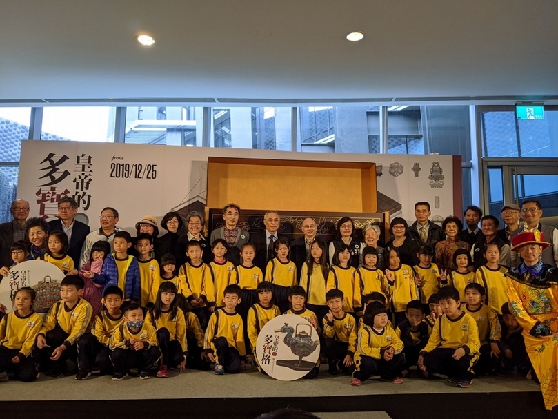 「皇帝的多寶格」特展於12月25日於國立故宮博物院南部院區盛大展開,記者會現場貴賓與參訪國小學生合影。(攝影/王怡文)