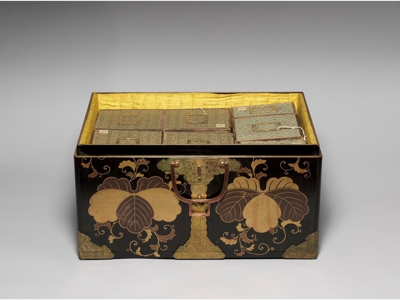 第一單元中最令人嘖嘖稱奇的,莫過於展場第一組展品清乾隆〈「采挹流霞」瓷器箱〉,一獨立展櫃擺放著此組瓷器箱的外箱,為日本的蒔繪漆箱,約莫製作於17世紀末到18世紀初,此類漆箱大多是作為貴族們外出時使用的置物箱。根據《活計檔》可知,清宮內廷曾收藏有一組「采挹流霞」的作品,乾隆皇帝更曾下令為其製作象牙吊牌。這組〈「采挹流霞」瓷器箱〉漆箱內共有19個木匣,木匣根據開盒設計、文物擺陳方式大致可以分為四種,展覽現場看板也特意繪製了木匣設計圖,想來對當時的造辦處工匠來說,把東西擺進盒子裡不是難事,要怎麼擺得好看、得皇上歡心,才是重中之重。〈「采挹流霞」瓷器箱〉原內裝有74件瓷器,現存67件,包含〈鬥彩雞缸杯〉、〈青花梵文杯〉、〈花蝶杯〉等,一個小漆箱裡能有如此大乾坤,引得出川哲朗都驚呼連連。
