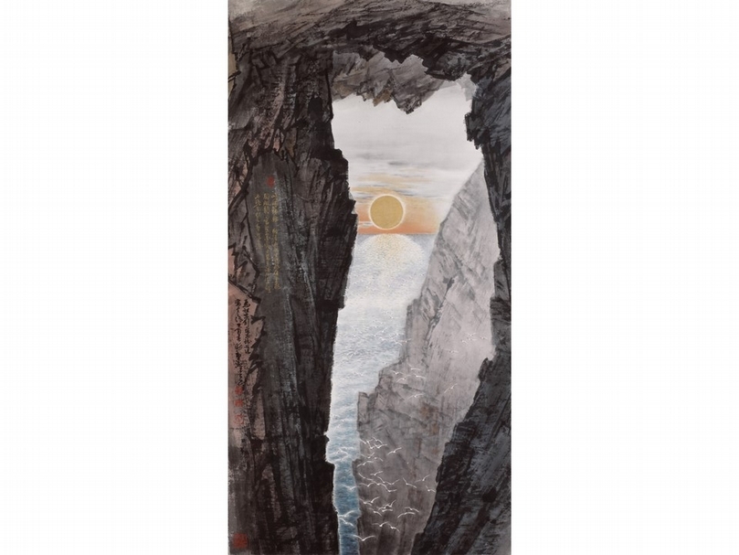 林章湖2017年《旭日翔鷗》,136×68公分。(林章湖提供)