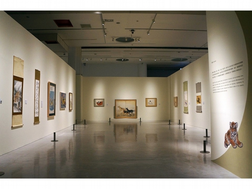 「林玉山作品捐贈特展」展廳一隅,正前方屏風為林玉山戰前的作品〈襲擊〉。(攝影/吳佳靜)