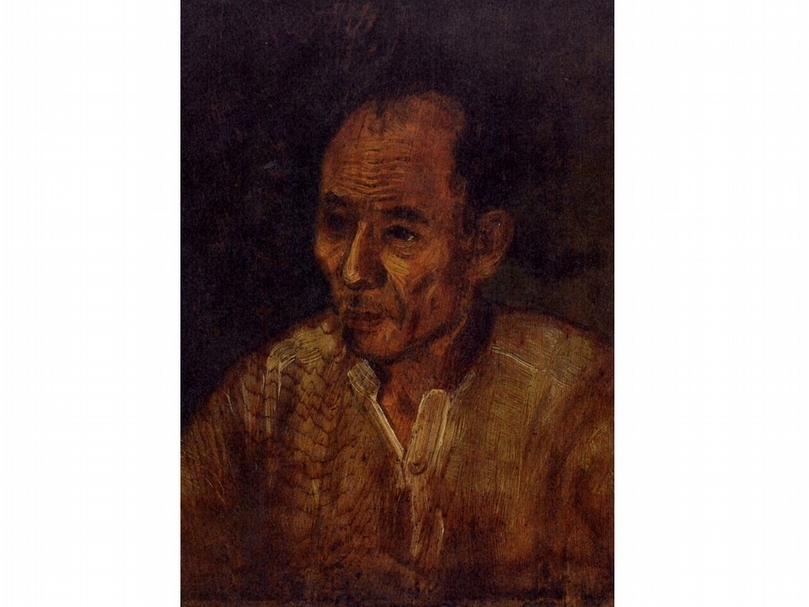 一直以來,林玉山都以水墨、膠彩畫著稱,但本展唯一的油畫作品《父親肖像》可印證其赴日求學時的一段插曲。林玉山前往日本川端畫學校接受美術訓練,受到同在日本的前輩陳澄波(1895-1947)影響,選念西畫科,幾個月後才決意轉科入日本畫科。曾有過的西畫學習經歷,使其具備油畫創作的技能。《父親肖像》是畫在木板上的小幅作品,以西方寫實的風格描繪,但對人物五官、衣物並無刻意強調與刻畫。父親只著簡單的軟質白色上衣,衣物底下原木紋路清晰可見;臉部微側、表情陰鬱、眉頭深鎖,似陷入長久沉思。林玉山對形神的理念追求不分媒材,掌握其父神韻的同時,畫面更有幽思的情緒氛圍。