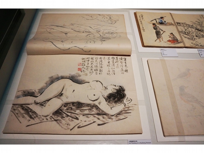 《水墨畫裸女臥》題款:「寫生是一種練習繪畫的基礎工作,雖畫的似亦僅係自然之再現耳,必須把握創作的美以彌補自然的不足為妙。」