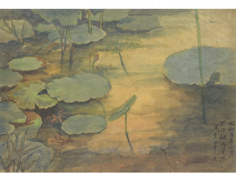 獲得第四屆台展「台展賞」、如今已是台灣國寶的《蓮池》,便是此番說法的最佳例證。限於捐贈展主題,本次僅設有新媒體互動區域,供民眾以身探索蓮池之美,但為了不讓這件重要的作品缺席其中,策展人精選與此作密切相關的《蓮池寫生》手稿展出。此稿件右下角紀錄畫家寫生當日時間地點,透過水彩的色調與畫面取景角度,能推知林玉山描繪此稿時所關注的重點:晨光下水色的用色層次及蓮葉漂浮水面的狀態。這些現地觀察的研究資料,清楚提示《蓮池》之所以不計成本大膽使用多層次的金粉,再現他所觀察到的蓮池水色變換之貌,並兼容宋畫與日本畫的技法風格,呈現精彩的視點、布局,絕非輕鬆僥倖,而是畫家一次次謹慎觀察、思考與研究的成果。