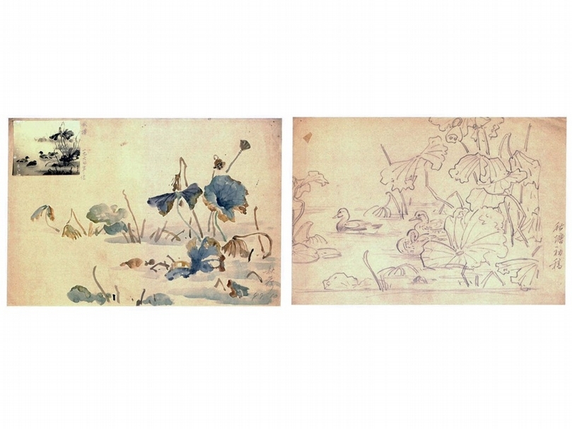 若欲進一步理解林玉山創作從初稿到最終實作的轉化歷程,本次展出的彩墨作品《秋塘水鴨》,以及《荷塘寫生》、《秋塘初稿》兩件手稿,或許是不錯的參照對象。相較《蓮池》,此作著重展現荷葉的各種姿態,兩張手稿中,一張進行畫面構成的測試、另一張則是對自然色相的設色練習,線條勾勒明確精準。手稿中共有的顯眼蝶狀枯葉造型及偏角構圖,最終都被保留於《秋塘水鴨》的畫面中,畫家也在該草稿左上角,貼上最後成品的黑白照片供比較、紀念。林玉山在《論寫生的重要性》一文曾言:「寫生之法,顧名思義,不只是寫其形骸,需要寫透對象形而上的內在精神。」林氏一生無窮盡地速寫、創作蓮池主題,親身示範「寫透」對象的理想追求實是沒有窮盡的道路,從不同年代、不同關注焦點的寫生手稿,可看出林玉山對畫面組織、主題表現上的兢兢業業,以及不斷求動、求新的藝術實踐能力。