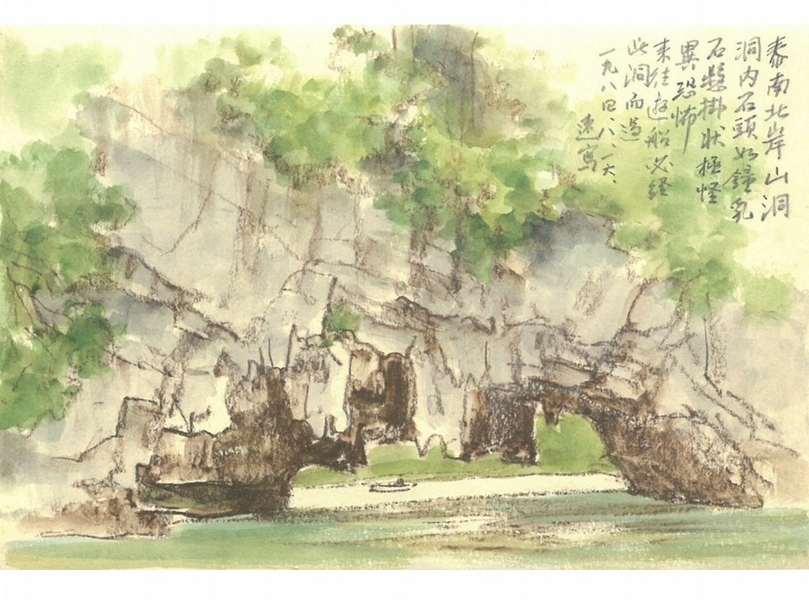 另外,1987年的彩墨作品《普吉重遊》,顯然是由1984年的寫生腹稿《洞內石頭如鐘乳(泰南北岸)》改稿而成。速寫稿件的右上以鉛筆寫著「來往遊船必經此洞而過」,洞右後方有遠方小船,三年後改稿為正式作品時,林氏基本上完全保留手稿的構圖與洞石造型,僅在前景添加近景遊船一艘,使畫面元素的遠近關係更為明確,同時強化寫生稿中的遊船印象。