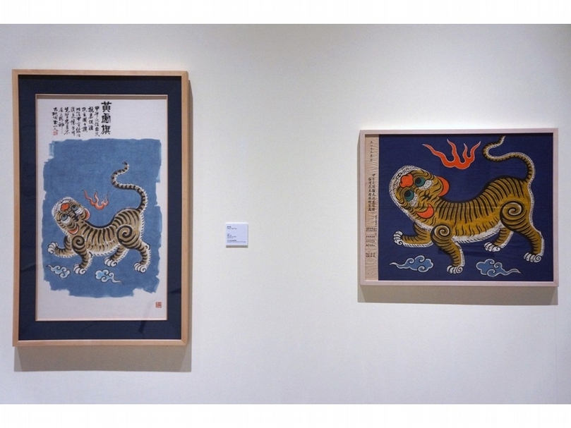 林玉山《藍地黃虎旗模製品》(右)與《黃虎旗》(左)展出現場,國立台灣美術館藏。(攝影/吳佳靜)